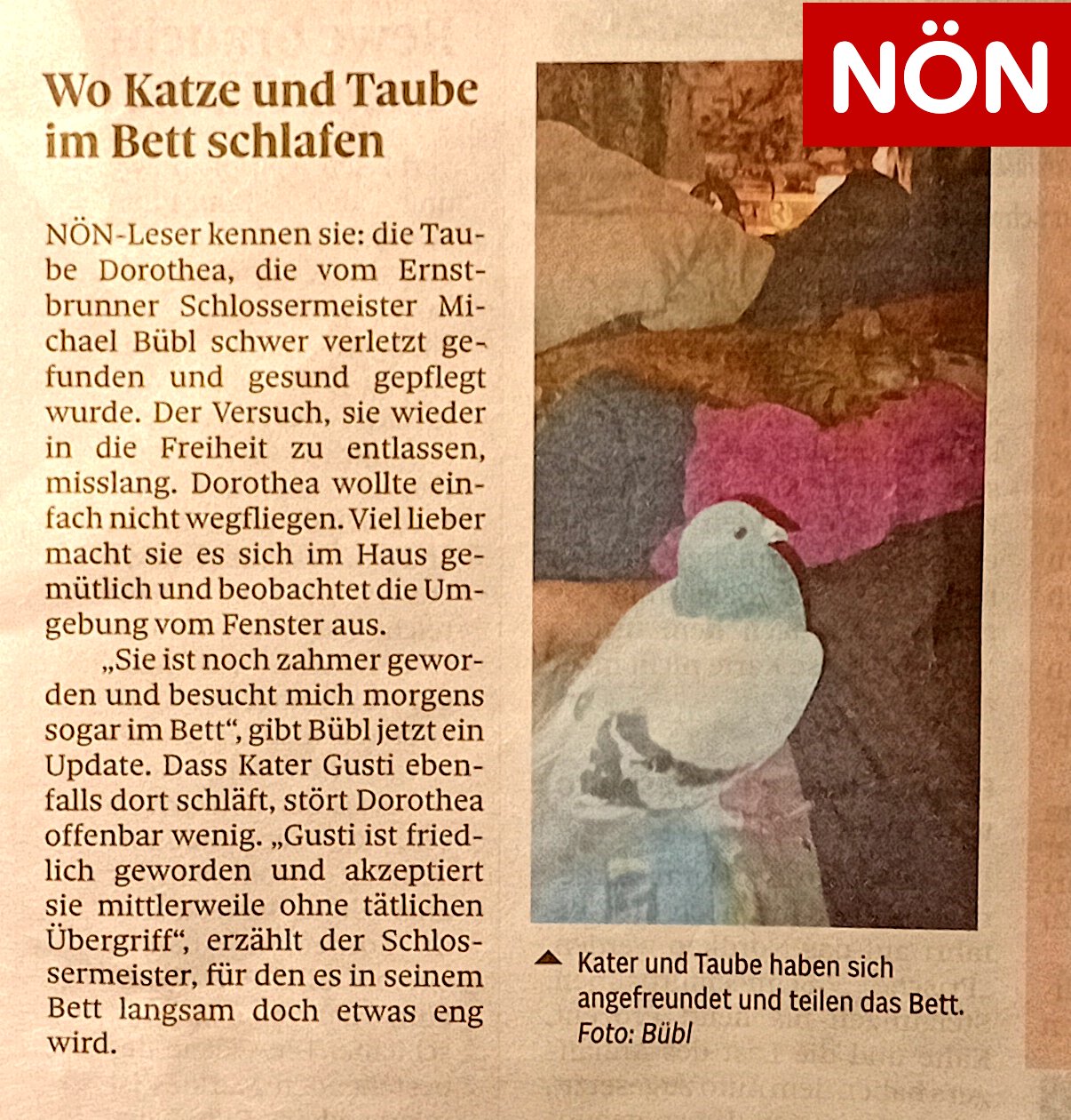 Die NÖN berichtet über diese seltene Verbindung – Mensch – Taube – Katze. Vielen Dank an das tolle Team von der NÖN.